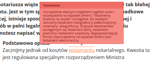 Dostęp do słowniczka masz z prawej kolumny strony oraz z treści wpisów. Terminy prawa spadkowego są w tekstach wyróżnione kolorem i podlinkowane. Wystarczy, że najedziesz kursorem na interesujący Cię wyraz, a pojawi się jego skróconą definicja. Kliknij, a zostaniesz przeniesiony do podstrony z szerszym wyjaśnieniem. Proste, prawda?